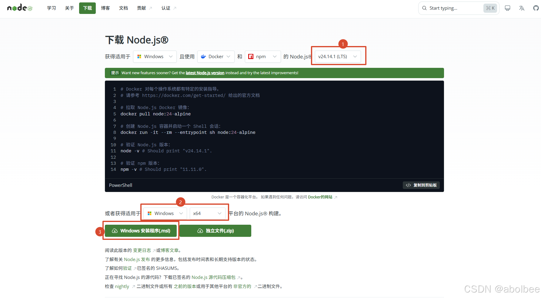 下载地址:https://nodejs.org/。注意要选择下载 LTS 版本、 .msi 安装包。