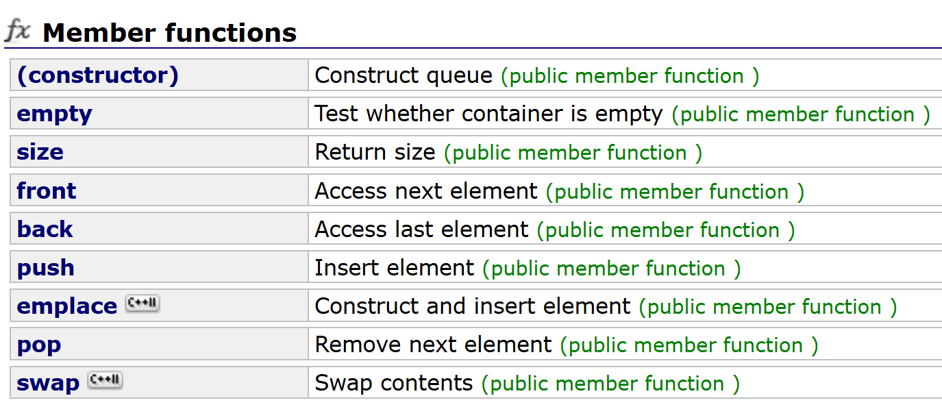 详见文档 :https://legacy.cplusplus.com/reference/queue/queue/?kw=queue