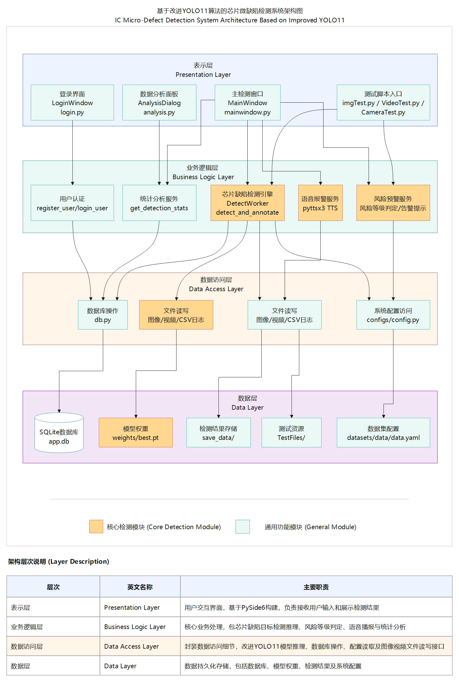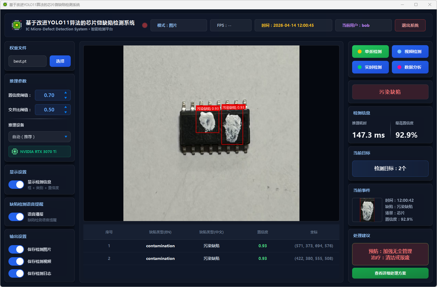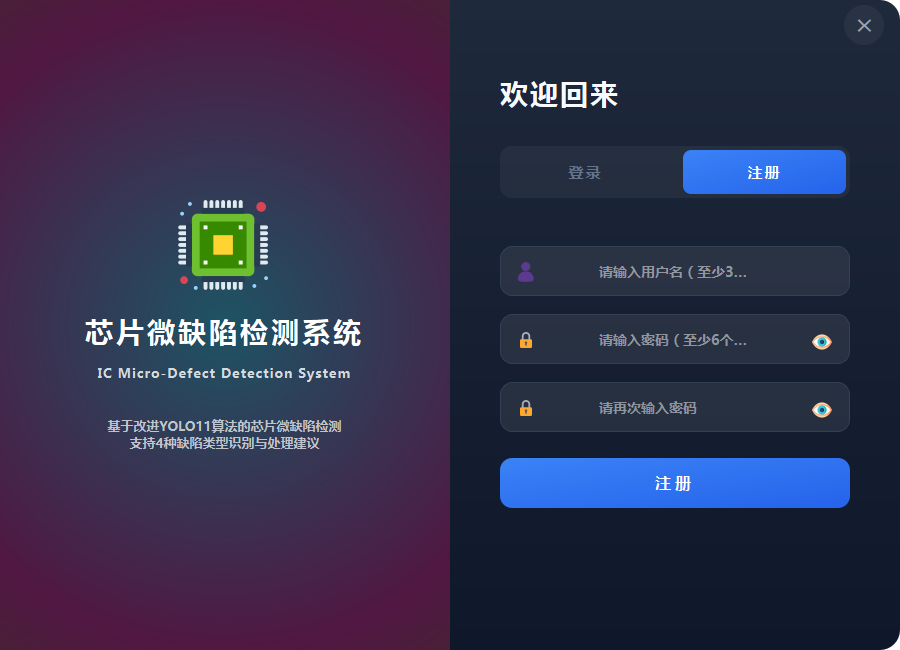 系统采用Python 3.12开发,基于Ultralytics YOLO11框架并进行P2-MDH改进实现芯片微缺陷目标检测,使用PySide6构建图形化界 面,通过OpenCV处理图像、视频和摄像头数据,并结合风险等级评估与处理建议推荐实现质量控制;同时采用SQLite数据库存储用 户信息,并对检测结果和分析数据进行管理与展示。系统面向芯片微缺陷检测与质量控制需求,集成用户登录注册、图片检测、视 频检测、实时检测、缺陷分类、风险评估、结果存储与统计分析等功能,为芯片制造智能化管理提供了一体化技术支持。