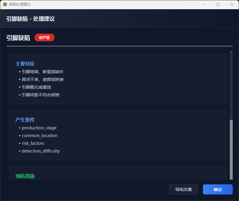 本系统集成用户登录注册、图像/视频/摄像头芯片缺陷检测、缺陷类型识别、风险等级评估、处理建议推荐、检测结果存储及统计分析等功能。