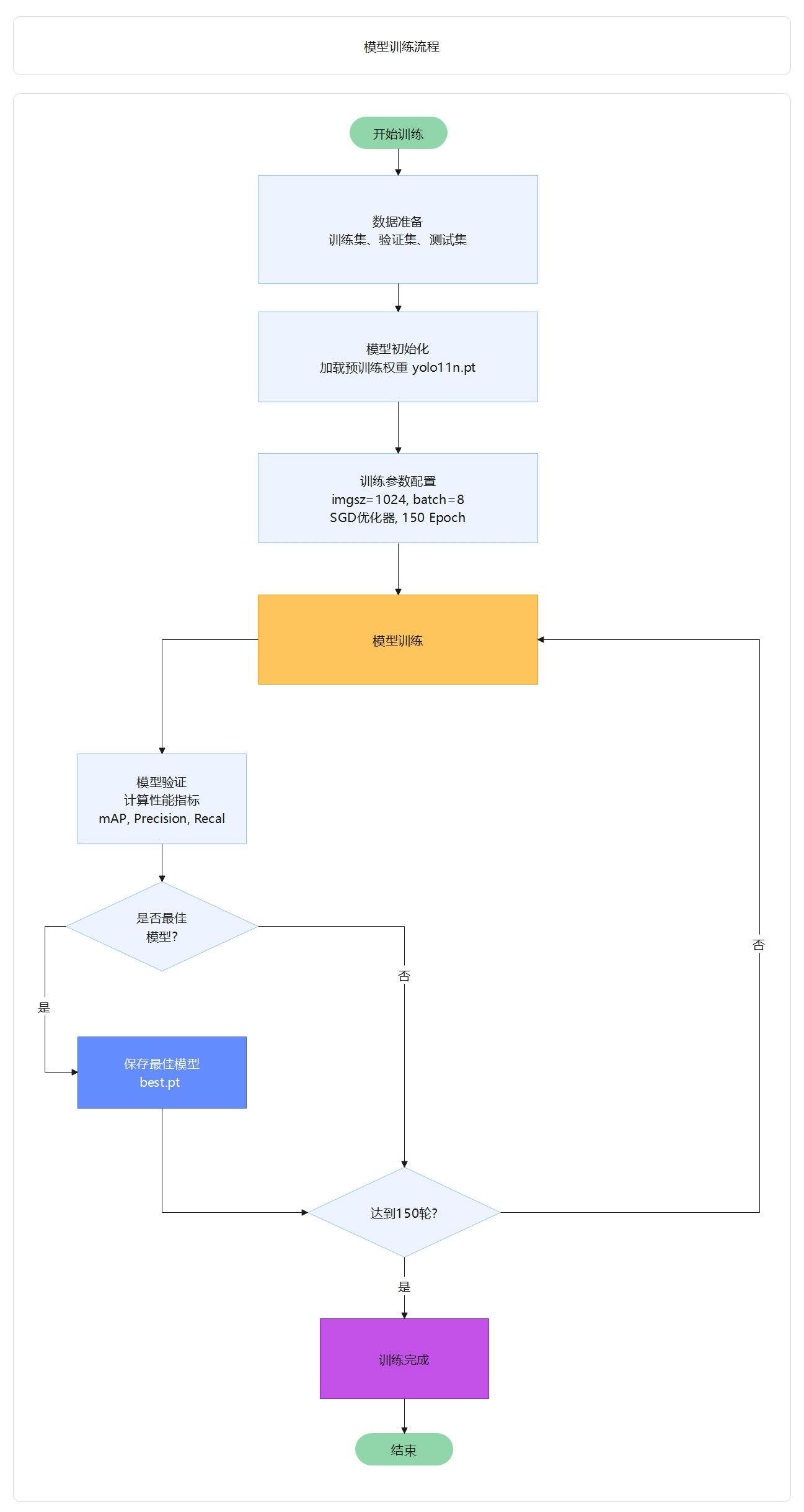 模型训练采用端到端的方式,首先加载训练集和验证集进行数据预处理,然后加载 YOLO11n 预训练权重进行模型初始化,接着使用 SGD 优化器进行 150 轮迭代训练,每轮训练后在验证集上评估性能指标,系统自动保存验证集上性能最佳的模型权重,最终输出完整 的性能指标和训练曲线。