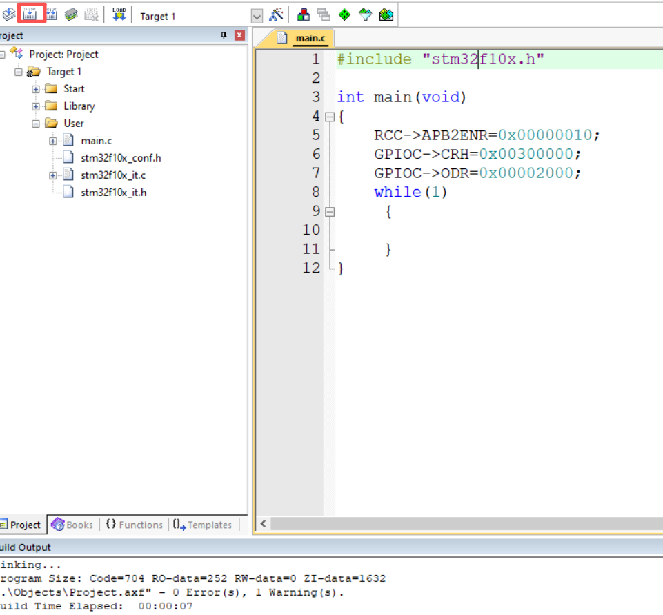 这里注意,Main函数是一个int型返回值void参数的函数,还有文件的最后一行必须要是空行,要不然会报警告的。然后我们点击这个按钮编译并建立工程
