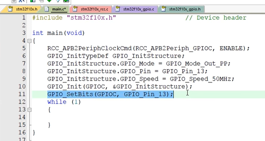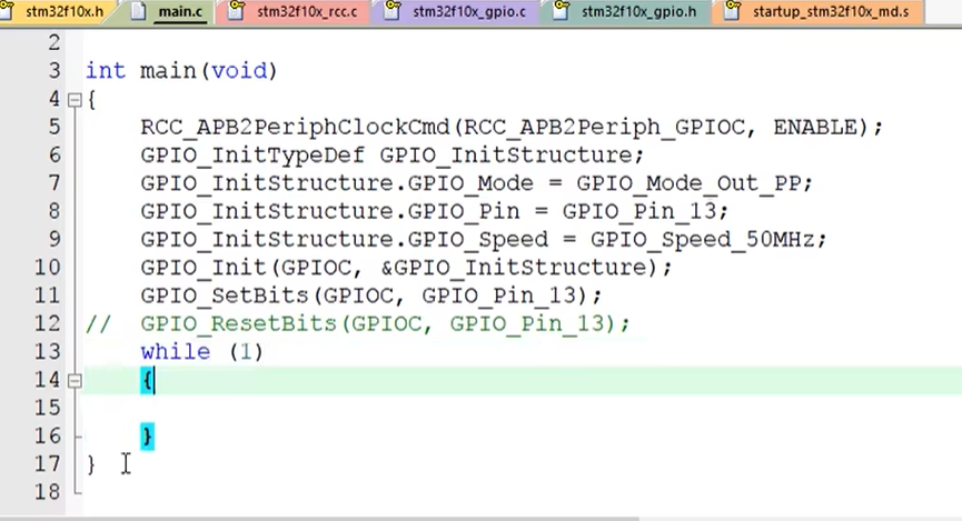 上面就是配置寄存器的的方式进行点灯对的操作,可以看出来,这种方式需要不断的查手册来了解每个寄存器的每一位都是干啥的。而且这个操作方式也有个弊端,就是我们把除了PC 13之外的位都配置成了零,这样会影响到其他端口的原有配置,如果要做到只配置这个PC13而不影响其他位,那还需要 &=和|= 的操作,这个在51单片机的视频里我们也经常遇到,那就会更加麻烦。所以这种寄存器的操作方式虽然代码简洁,但是还是不太方便。那接下来我们就要为这个过程添加库函数了,不函数和寄存器的操作方式有哪些区别
