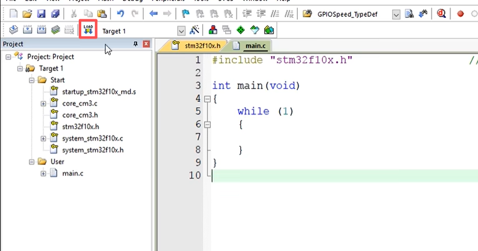然后重新编译一下没有错吧,再点击这个 load 按钮,如果一切正常的话,这个程序就会下载到 STM32 里面了,我们看一下板子,可以看到这个灯已经不闪了,