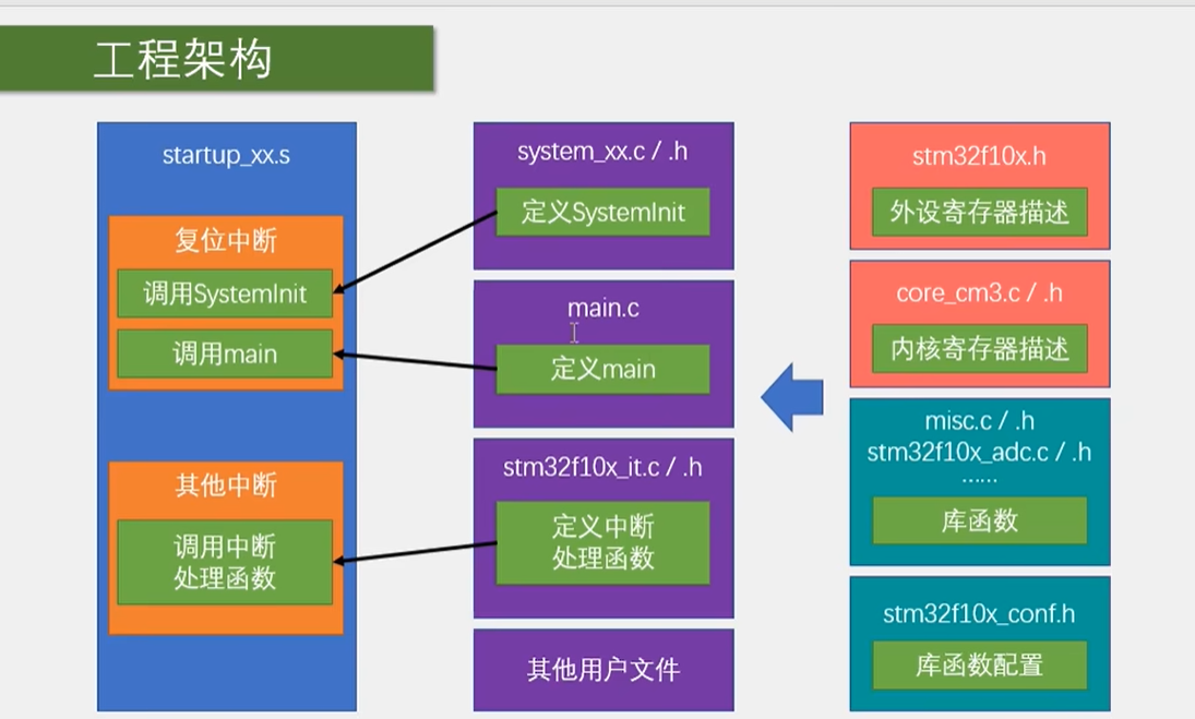 剩下右边的就是被动执行的东西了,相当于 STM32 的资源,我们在主函数或者中断函数里就可以调用这些资源了。右上角这两个 F103 . h 和 core - cm3 这些文件就是外设和内核外设的寄存器描述。在 Keil 中我们可以看到这里面都是寄存器和寄存器每一位的名字啊,还有地址信息等。如果直接调用这些寄存器来使用 STM32,那就是寄存器的开发方式。我们已经试过了这种方式会有一些弊端,也比较麻烦。所以 ST 公司就提供了下面这两个文件,这个就是库函数文件,在 Keil 中可以看到。这每个外设都提供了一大堆的函数,这些函数分装了寄存器的操作,给我们提供更加人性化的函数调用方式。