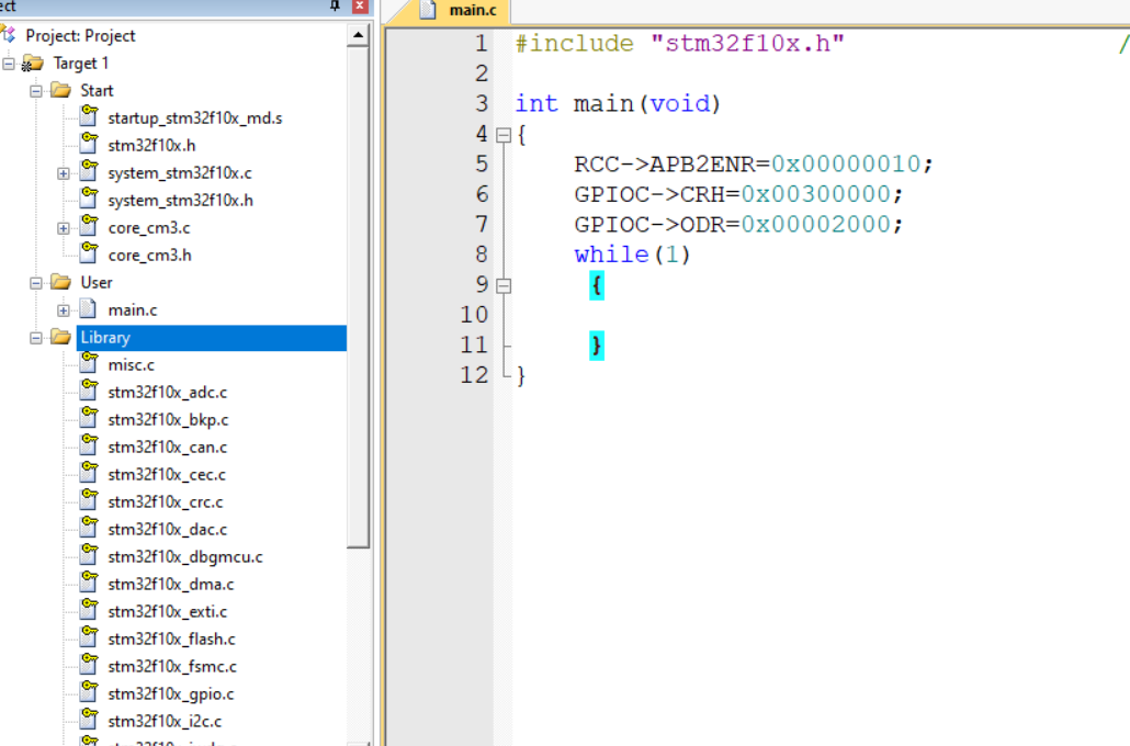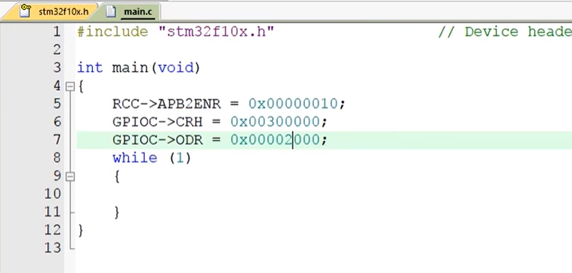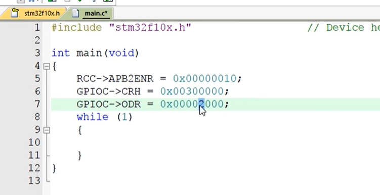 然后我们回到 Keil,在 while 死循环之前写上 RCC 的 AHB2ENR 寄存器等于 0x0000 0010,这样就可以打开 GPIOC 的时钟了
