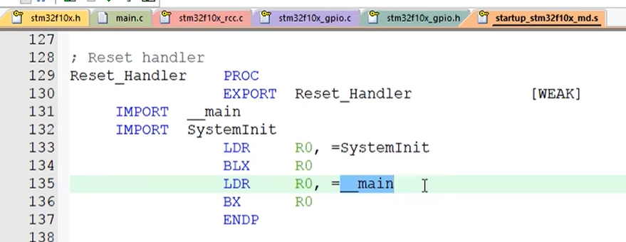 可以看到这是复位的中断函数,然后调用 SystemInit,再调用 main,然后程序就结束了。当然实际上单片机的程序永远也不会结束,所以在 main 函数的最后一定是一个死循环。