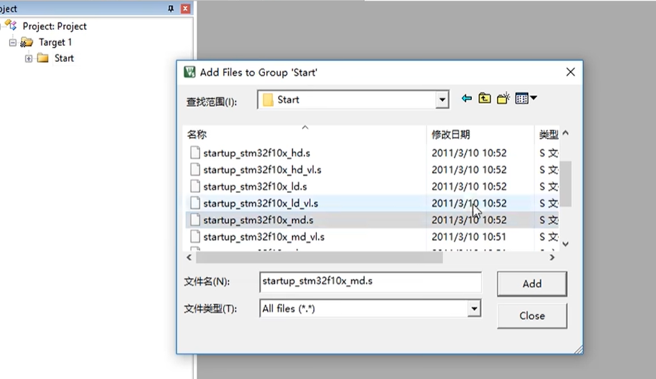 我们首先添加一下启动文件,这个启动文件有很多分类,我们只能添加其中一个。我们视频所用型号需要选择这个后缀为 md.s 的启动文件。至于启动文件这个怎么选择,我等会再讲啊。我们选中它,点击 Add。
