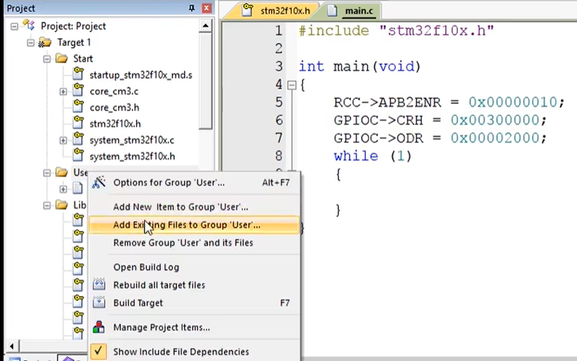 在这个 main . c 里我们先右键插入头文件,选择 STM32F10X 点 h。