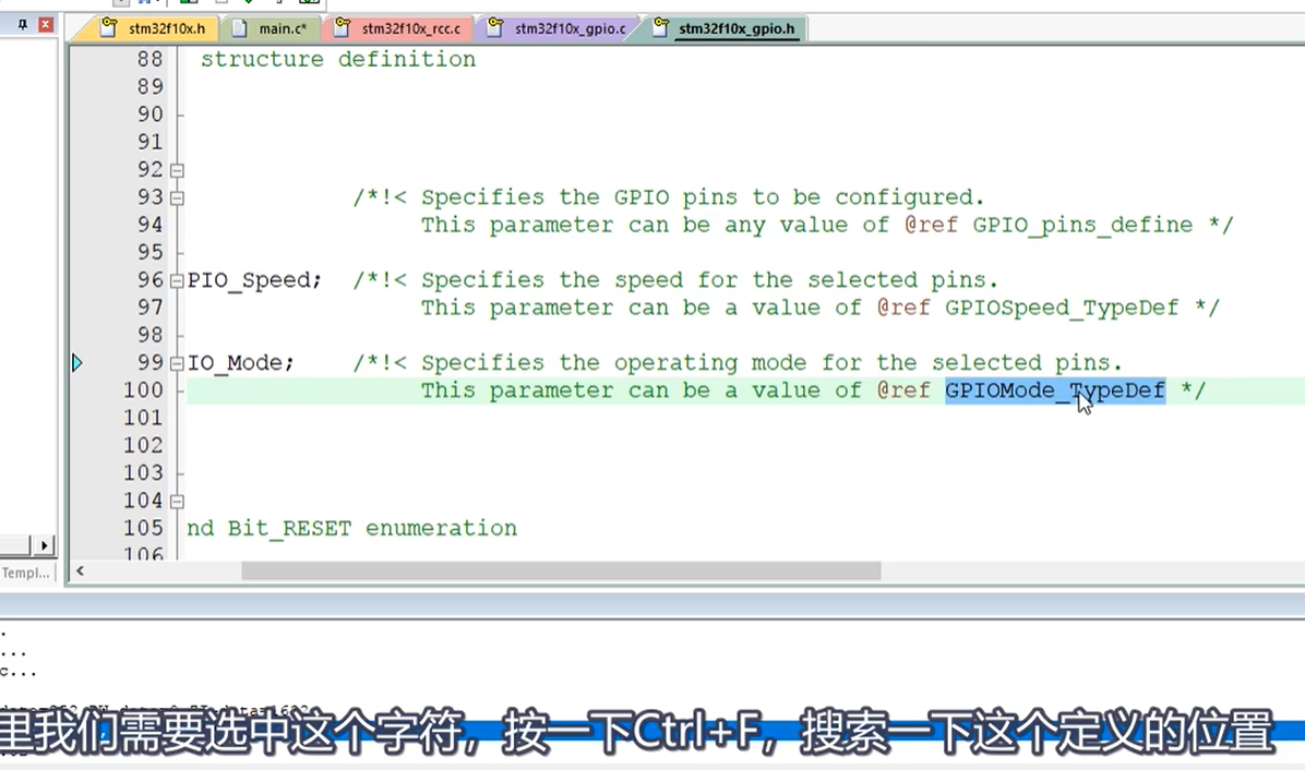 右键转到 mode 的定义。这右边的介绍说这个参数可以是 GPIOMode,typedef 里面的一个值。因为这是注释里面的东西啊,所以没办法用右键跳转了。那这里我们需要选中这个字符,按一下 CTRL + F,搜索一下这个定义的位置。