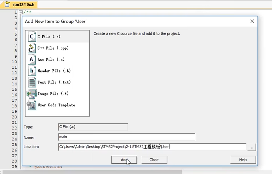 然后点击 Add, 这样我们就有了 main .c 文件了。那在工程文件表的 User 目录下也可以看到我们新建的 main .c 文件。
