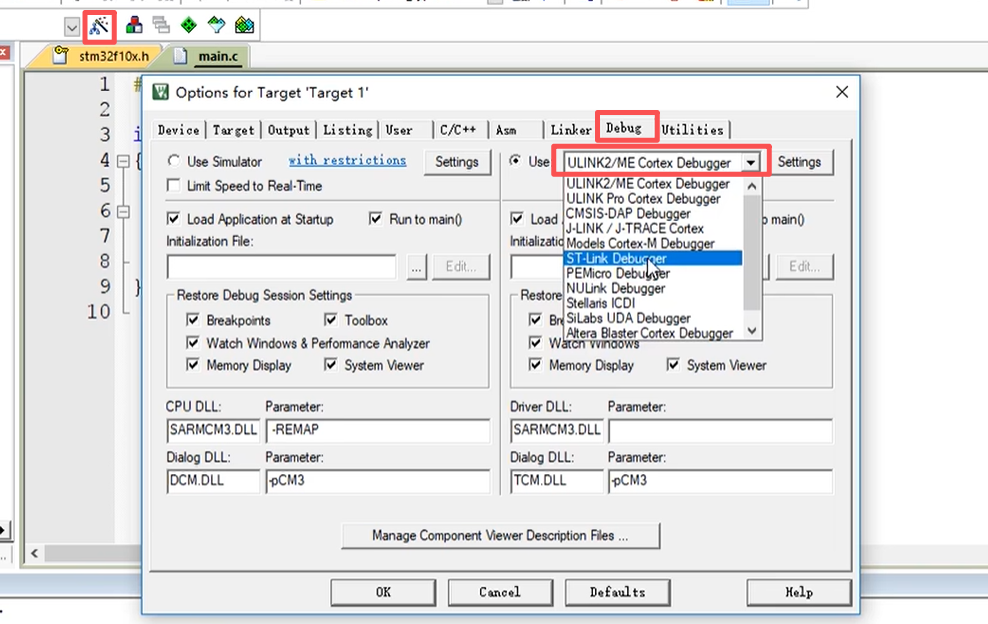 然后我们再在 Keil 里面配置一下调试器,点击魔术棒按钮,选择 Debug,这个调试器默认是 UniLink 啊,我们用的是 STLink,所以选择 STLink Debugger,然后再点击右边的设置按钮,在 Flash 下载这一项把这个 Reset and Run 这一项勾上