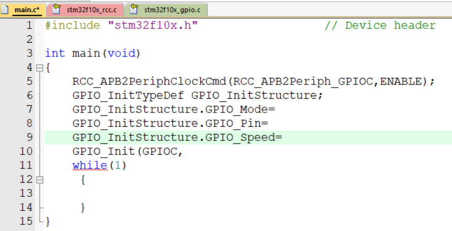 我们再用库函数来实现点灯的操作。我们先把这三句删了。