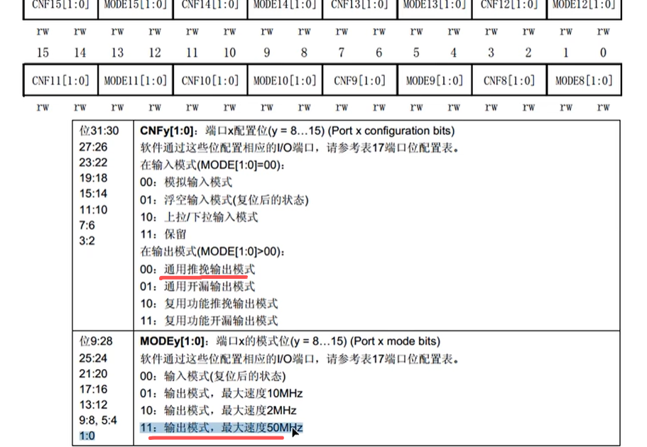 下面的说明我们看一下,这个 CNF 我们需要配置为通用推挽输出模式,也就是这两位为 00,MOD 要配置为输出模式,最大速度可以给 50 兆赫兹,也就是这两位为 11。