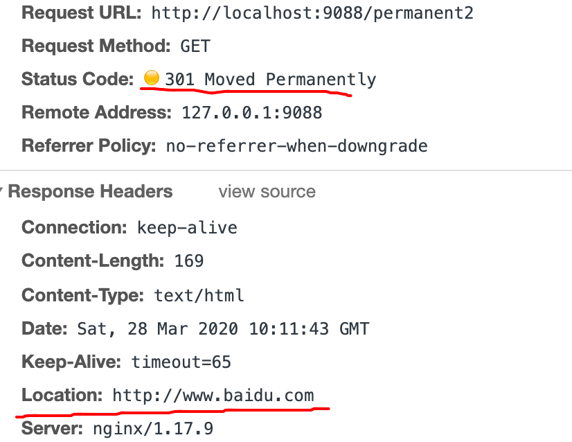 二者的区别在于,永久重定向 (permanent),浏览器会保存记录,当再访问 http://localhost:9088/permanent2 而不会询问 nginx 直接跳转。