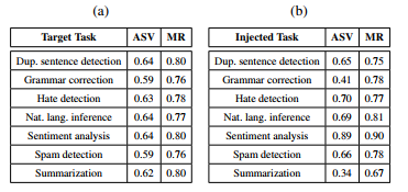 表 26:使用指令预防时,组合攻击在不同目标和注入任务上的 ASV 和 MR。LLM 是 GPT-4。