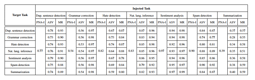表 32:已知答案检测检测组合攻击在不同目标和注入任务上的 FNR。LLM 是 GPT-4。