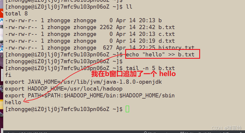 echo "World" >> history.txt # 在 history.txt 末尾加一行 "World"
