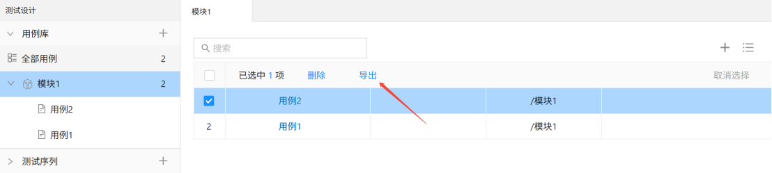 当仅需导出部分用例时,可在用例列表中将鼠标悬停在目标用例前的序号位置,序号会自动切换为复选框。勾选所需用例后,点击列表上方的"导出"按钮即可完成导出,如下图所示。