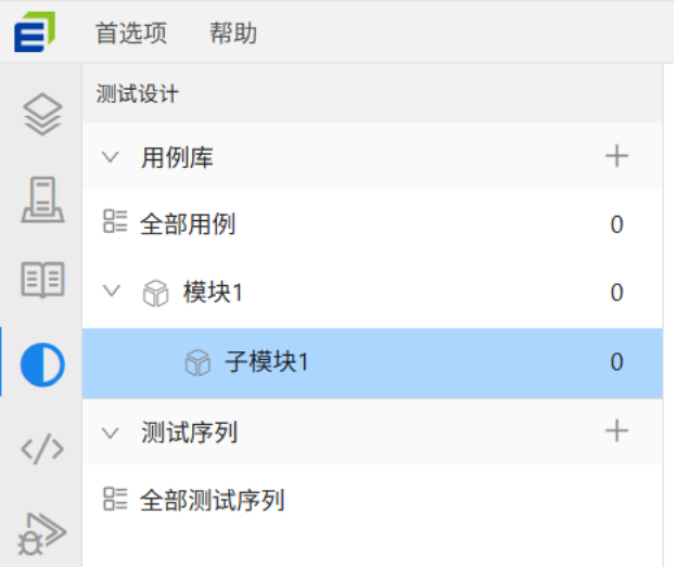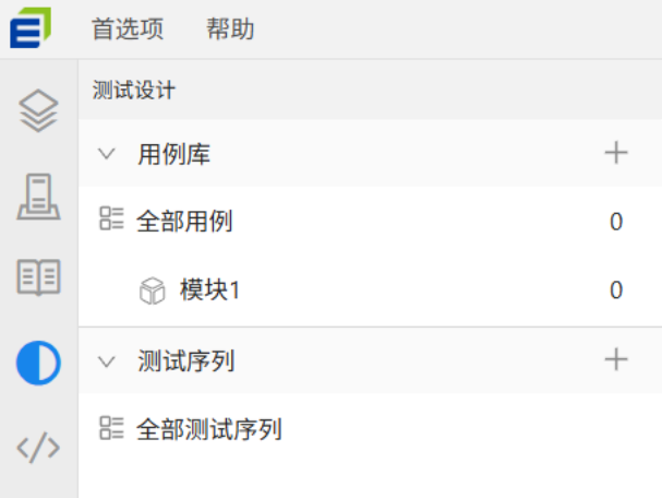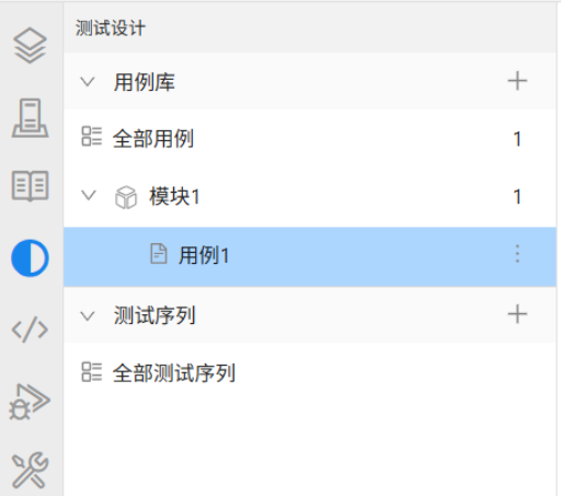 侧边栏中点击对应的图标进入【测试设计】模块,如下图所示,【测试设计】模块包含【用例库】、【测试序列】两个导航菜单。