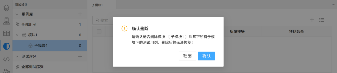在【测试设计】导航菜单下,将鼠标悬浮在【子模块1】上,点击右侧显示的图标,弹出悬浮框,在悬浮框中选择【删除】菜单,系统自动弹出是否确认删除的提示框,点击确认即可删除当前模块及其子模块,如下图所示。