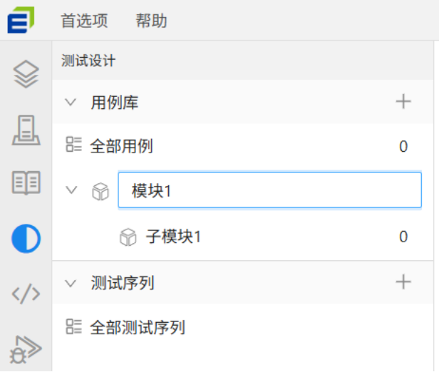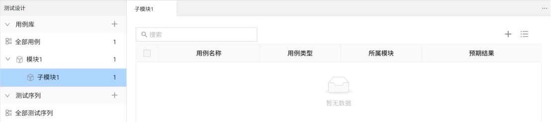 在【测试设计】导航菜单下,点击【用例库】菜单右侧的"+"图标,如下图所示,然后输入"模块名称",按下回车,列表显示刚创建的模块,新增后的模块。