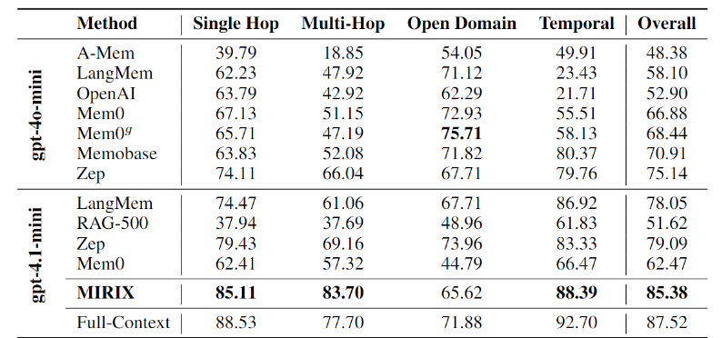 - 多跳提升最大:超基线 24%+,因 MIRIX 提前融合信息,无需实时拼接