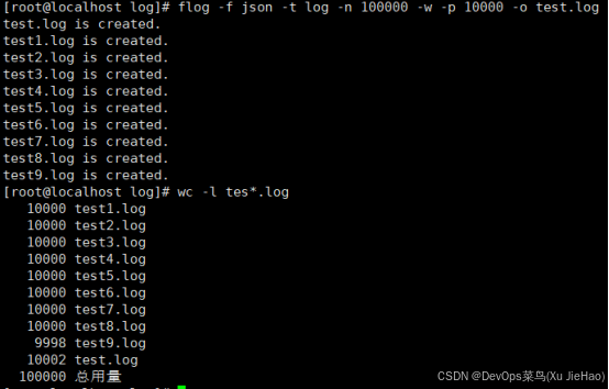 flog -f json -t log -n 100000 -w -p 10000 -o test.log