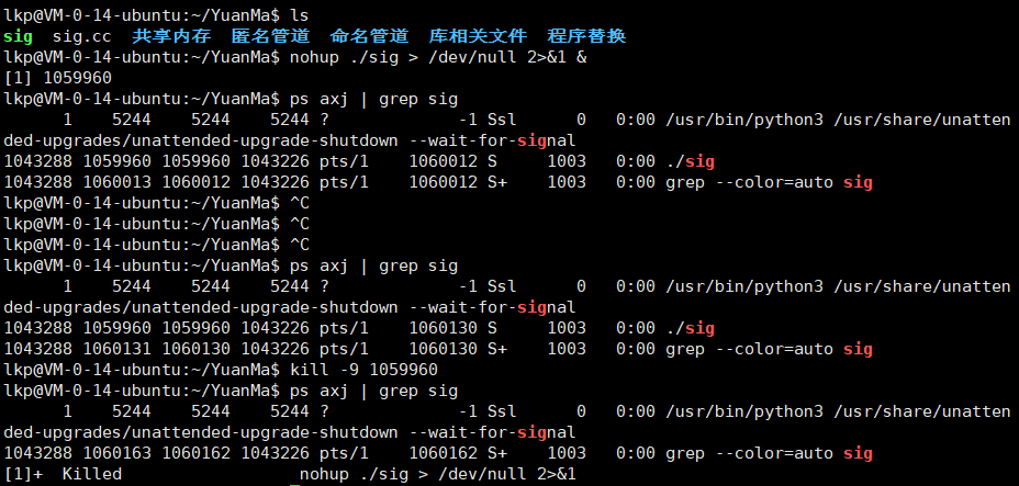 cpp#include <iostream> #include <unistd.h> #include <signal.h> void handler(int signumber) { std::cout << "我是: " << getpid() << ", 我获得了⼀个信号: " << signumber << std::endl; } int main() { std::cout << "我是进程: " << getpid() << std::endl; signal(SIGINT/*2*/, SIG_IGN); // 设置忽略信号的宏 while(true) { std::cout << "I am a process, I am waiting signal!" << std::endl; sleep(1); } }把2号信号忽略了,无法通过2号信号终止进程了