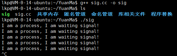 cpp#include <iostream> #include <unistd.h> #include <signal.h> void handler(int signumber) { std::cout << "我是: " << getpid() << ", 我获得了⼀个信号: " << signumber << std::endl; } int main() { std::cout << "我是进程: " << getpid() << std::endl; signal(SIGINT/*2*/, SIG_DFL); while(true) { std::cout << "I am a process, I am waiting signal!" << std::endl; sleep(1); } }