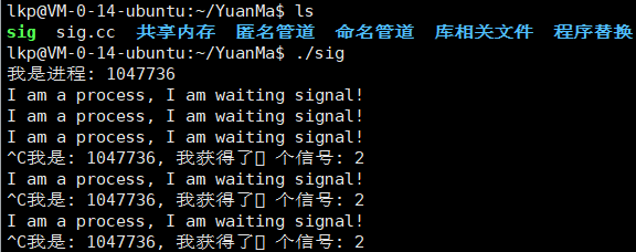 cpp#include <iostream> #include <unistd.h> #include <signal.h> void handler(int signumber) { std::cout << "我是: " << getpid() << ", 我获得了⼀个信号: " << signumber << std::endl; } int main() { std::cout << "我是进程: " << getpid() << std::endl; signal(SIGINT/*2*/, handler); while(true) { std::cout << "I am a process, I am waiting signal!" << std::endl; sleep(1); } }📍 注意看源码: