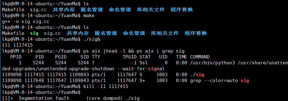 - 指定发送某种信号的kill命令可以有多种选法,所以上面的命令可以写成kill -11 1117415,11是信号SIGSEGV的编号;以往遇到的段错误都是由非法访问产生的,而这个程序本身没错,给它发SIGSEGV也能产生段错误