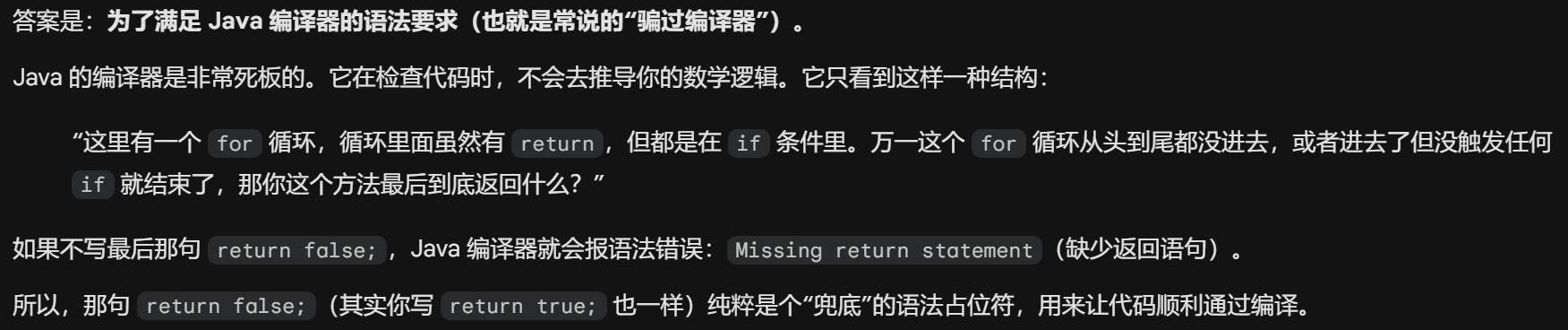 //问题1:这里return逻辑不会被执行,为什么还要写?