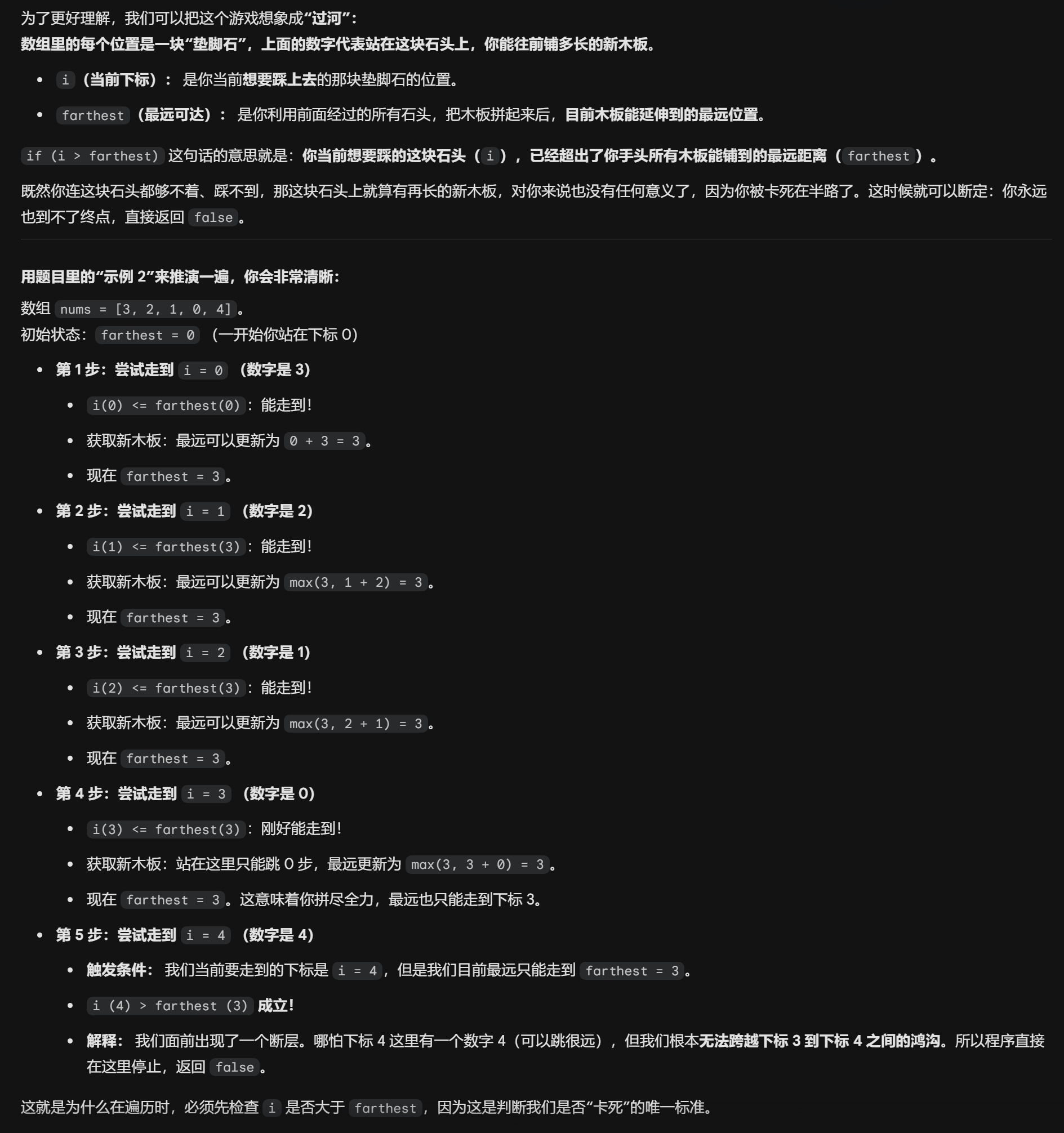 // 如果当前遍历的下标 i 已经超过了所能到达的最远距离,说明无法继续前进