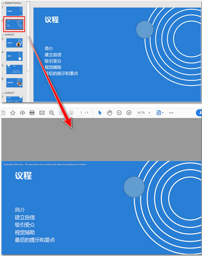 在某些场景下,我们可能只需要将演示文稿中的特定幻灯片转换为 PDF,而不是整个文件。例如,从大型培训材料中提取关键章节,或从销售演示中抽取产品概览部分。Spire.Presentation 允许我们单独选择某张幻灯片并进行转换。