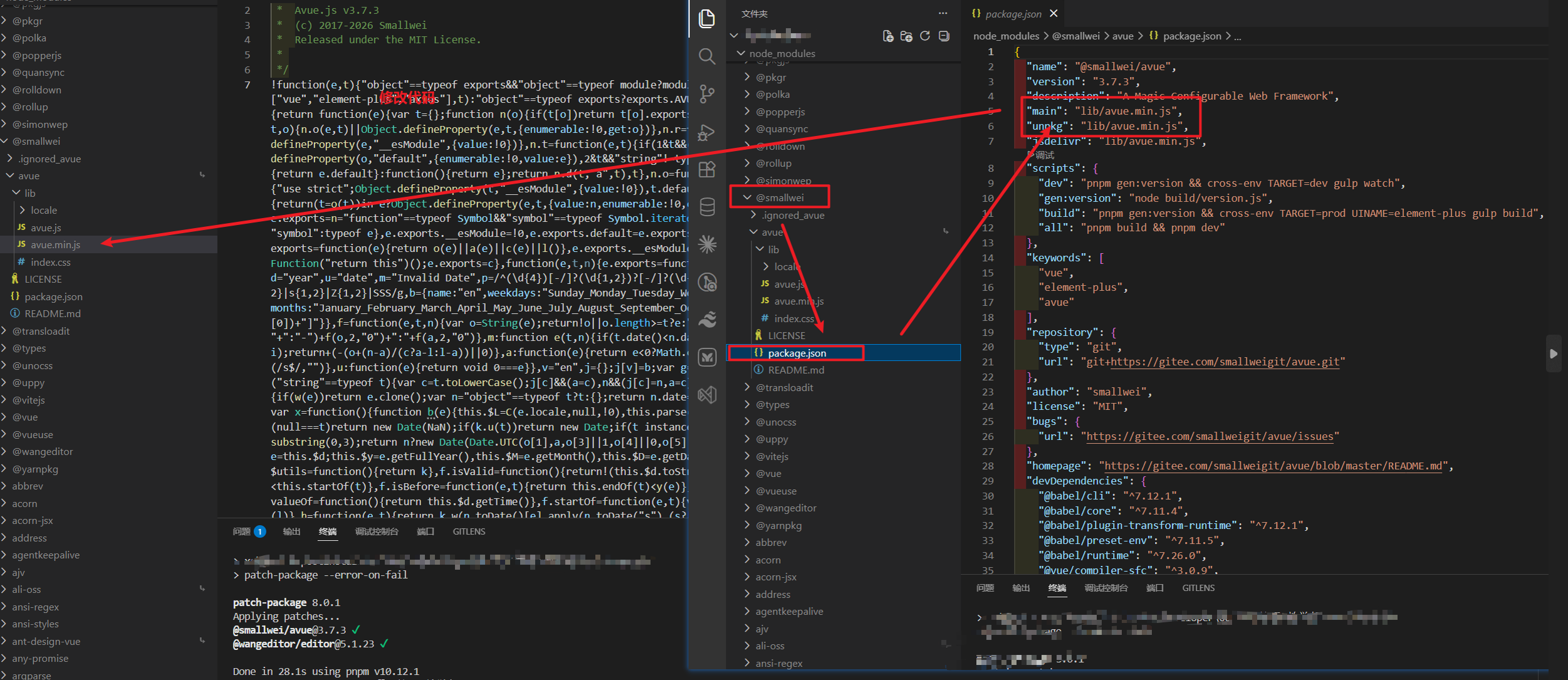 # 定位到 node_modules/@smallwei/avue 的代码,并修改代码