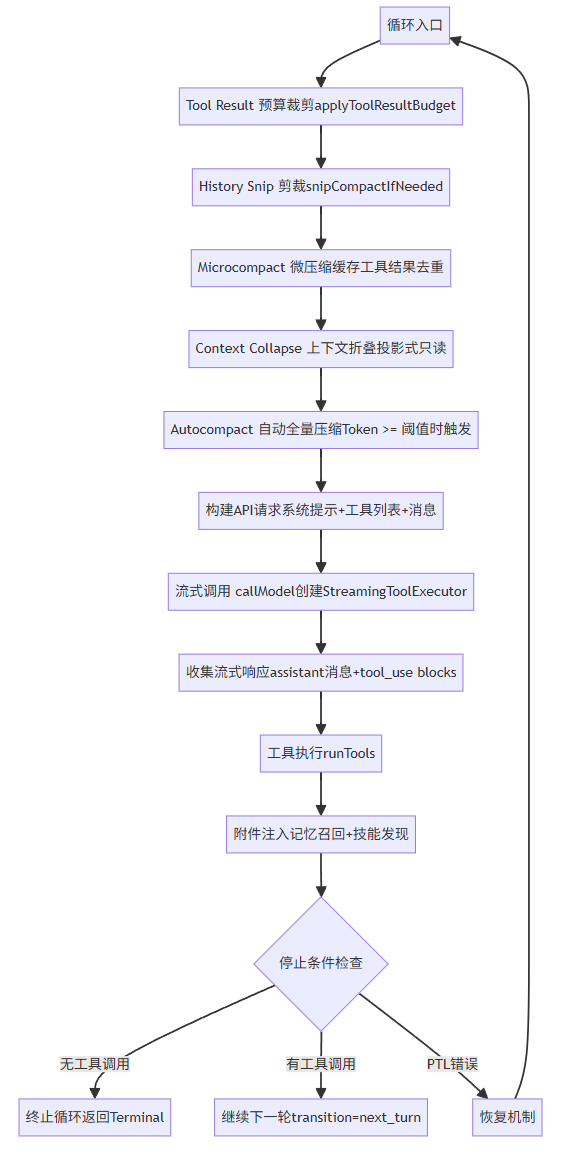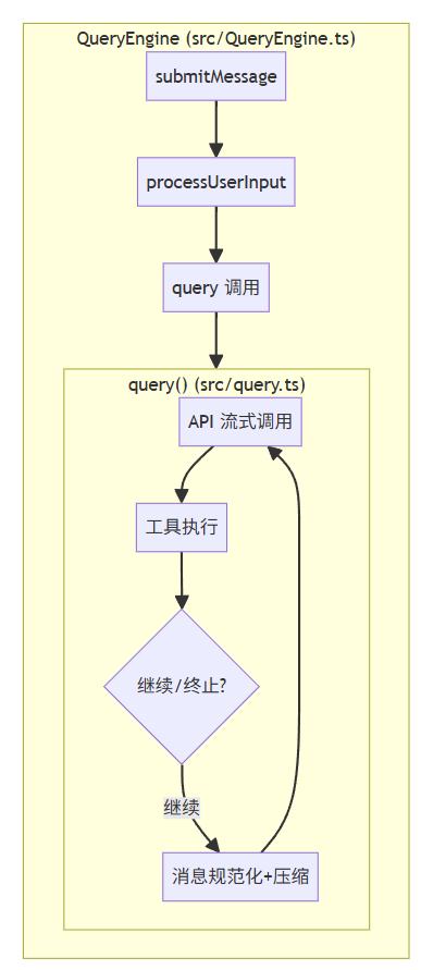 query就是claude code的核心循环,Claude Code 给我最大的感受就是他的上下文管理,传统的ReAct的 Agent Loop 就是"观察 → 思考 → 行动 → 再观察"的循环,但是Claude也把上下文压缩作为里面的一部分,更加类似于"上下文压缩 → 观察 → 思考 → 行动 → 再循环"。
