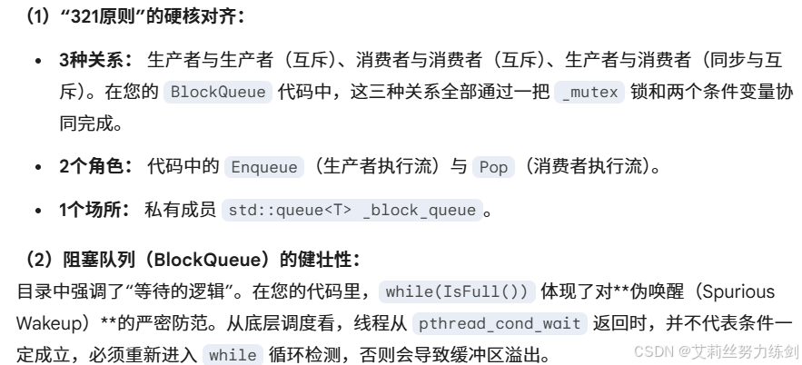 (2)预防机制 : 如果使用 if,线程唤醒后会直接向下执行 push,此时队列可能已被另一个抢先的生产者填满,导致缓冲区溢出。使用 while 强制线程在唤醒后重新检测条件。如果不满足,则继续挂起。这保证了逻辑的绝对安全性,避免了因数据状态不一致引发的系统性阻塞。