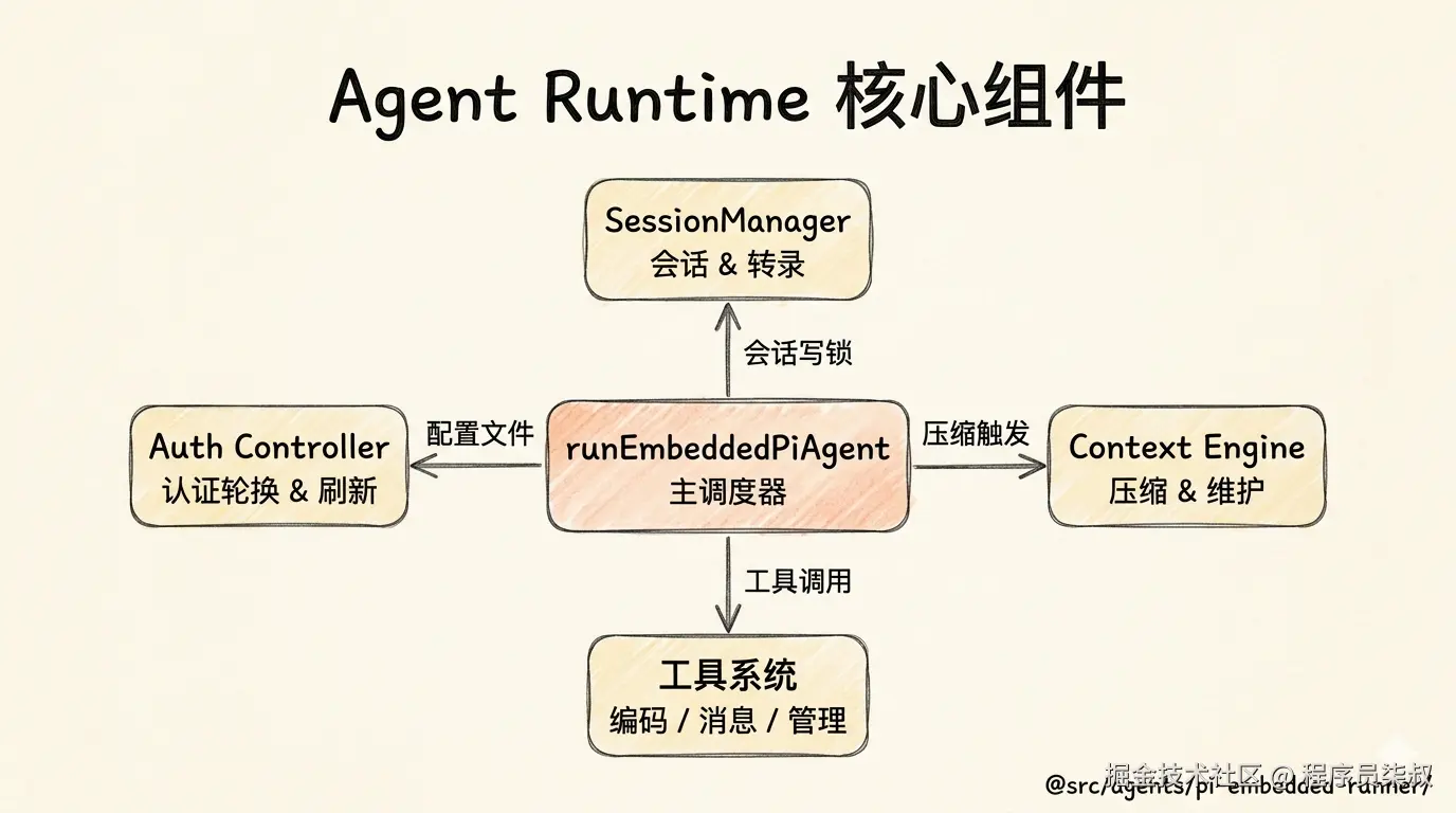 Agent 运行时模块是 OpenClaw 的核心执行引擎,负责运行 AI Agent、管理模型调用、处理工具执行和流式响应。基于源码验证,该模块采用嵌入式 Pi Agent 架构,支持多模型、故障转移、身份验证轮换和工具执行管道。