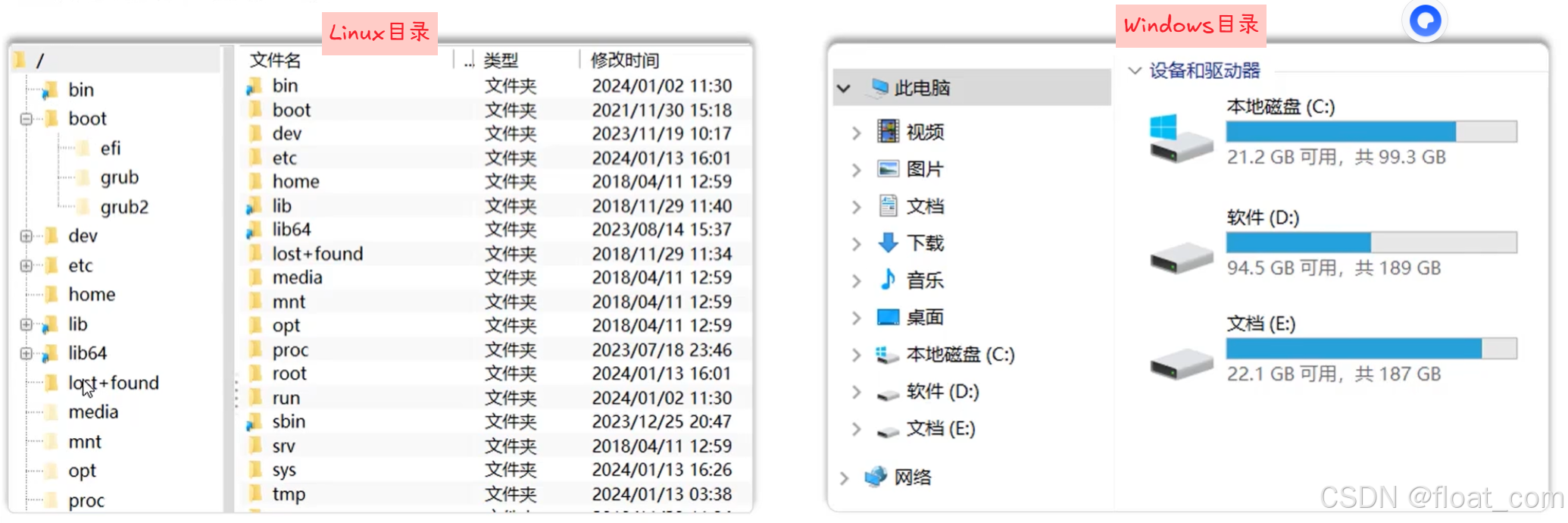 | Windows | 以盘符为根(C盘、D盘、E盘),目录归属于盘符 |