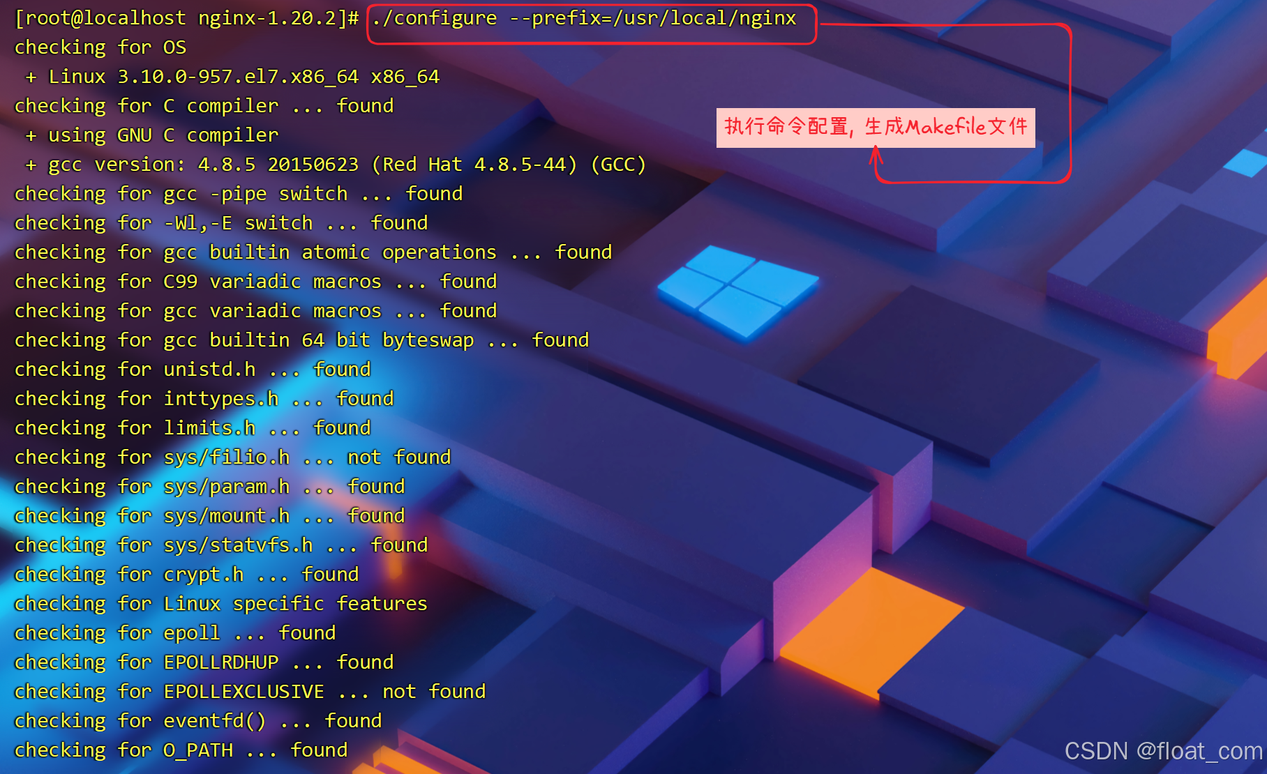 执行 ./configure 脚本,检查系统环境并生成 Makefile 文件。