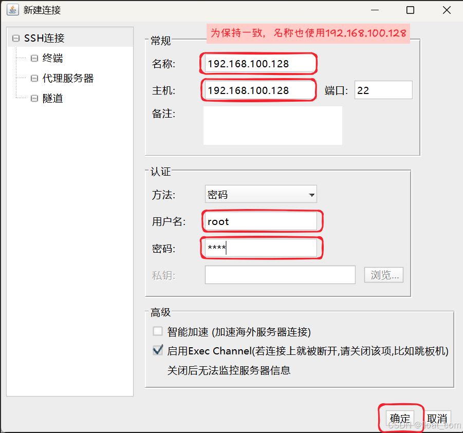 | 名称 | 自定义 (如: CentOS-Node) | 用于标识该连接的名称 |