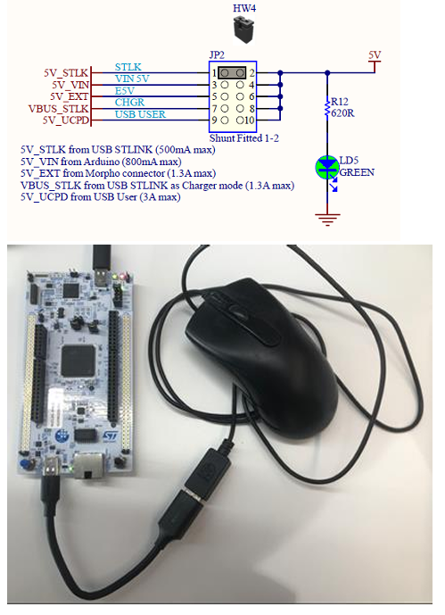 'STLK'(JP2:1~2)和 'USB USER'(JP2:9~10)用于 VBUSC 供电。如下图所示: