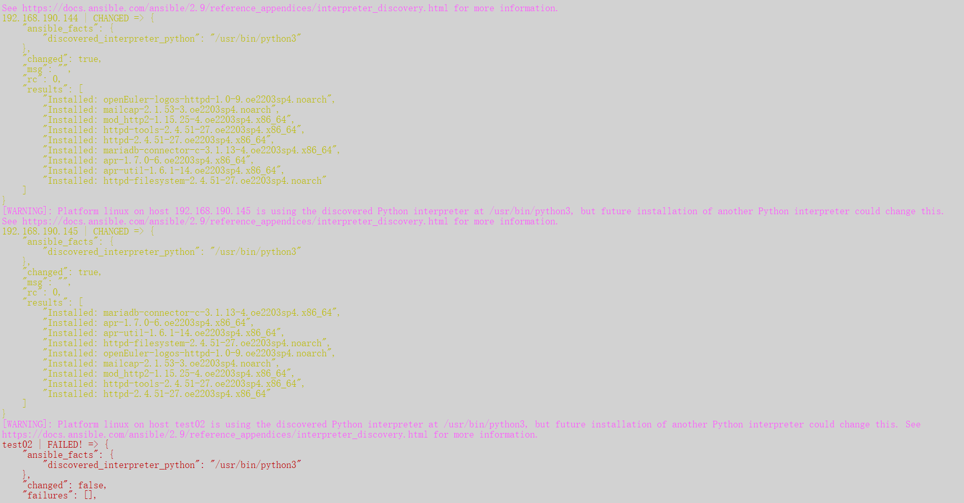 在多主机运维场景下,Ansible 可实现批量配置、软件部署等自动化操作,大幅提升运维效率。本文基于 openEuler 操作系统,使用 Ansible 的 dnf 模块批量安装 httpd 服务,并对执行过程中的警告、报错信息进行详细解读,同时给出优化方案,适合 Linux 运维初学者参考。