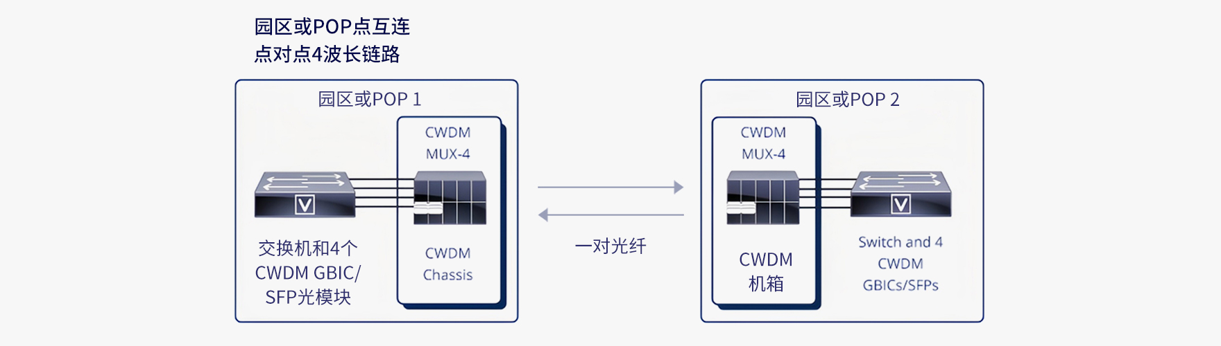 **点对点单纤链路:**通过在同一根光纤上以不同波长发送和接收信号,可在单纤上最多传输4个通道。下图展示了一个采用4个波长的点对点单纤链路。