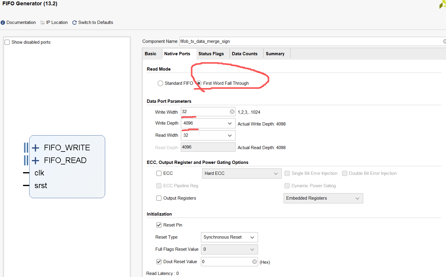 这是配置的第一页,决定了这个 FIFO 的核心物理架构。"给我用芯片上的物理硬核内存(BRAM),搭建一个不用跨时钟域(Common Clock)的、可以直接受我底层状态机裸线控制(Native)的巨大蓄水池。"