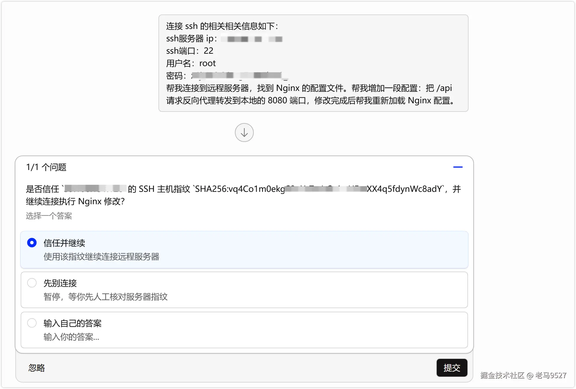 收到指令后,它能接管终端代理你执行 SSH 访问,自动搜寻服务器上的配置文件并完成编辑,最后还会自动重启服务。哪怕你暂时忘了 Nginx 的安装路径或具体的重启命令,它都能游刃有余地帮你完成。