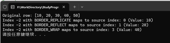 std::cout << "Index " << p << " with BORDER_REPLICATE maps to source index: " << idxReplicate << " (Value: " << (int)row.at<uchar>(0, idxReplicate) << ")" << std::endl;