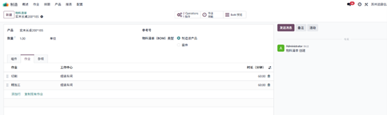 在工序选项卡中定义两道生产工序:切割与精加工。两道工序均在组装 1 工作中心执行,且精加工工序需在切割工序完成后进行。