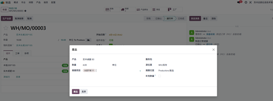 系统将弹出新窗口,可录入报废产品信息,包括产品名称、数量、批次 / 序列号等。确认后点击报废产品 ,即可将物料从库存转入废品库位,如下图所示。